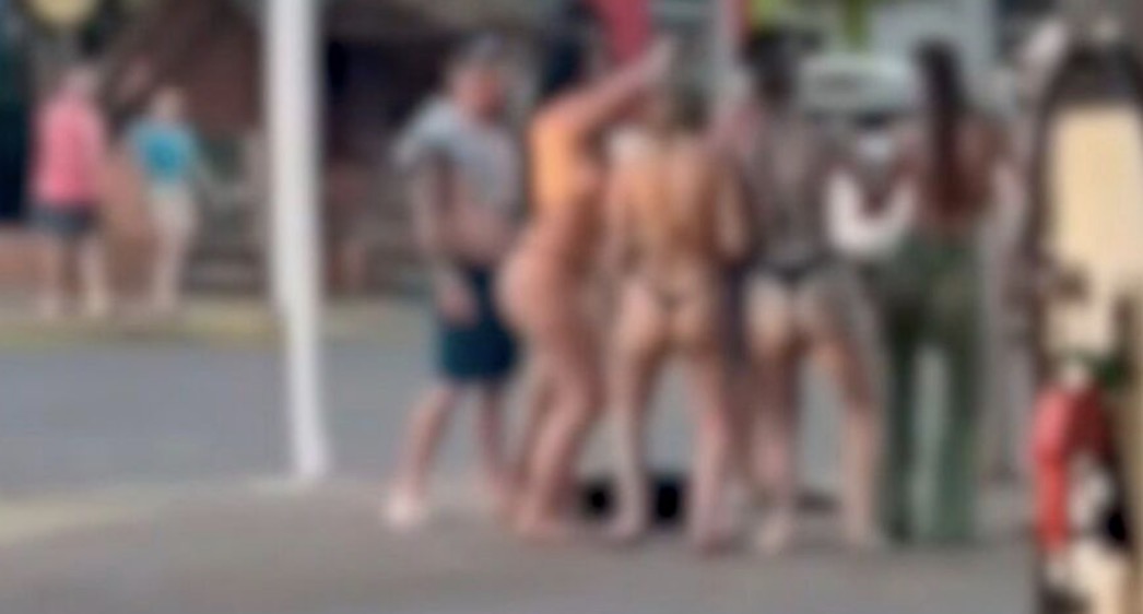Também compartilhado nas redes sociais, mulheres, de corpos desenhados, foram filmadas dançando de biquíni fio dental, em frente a um posto de combustível, no município de Bonito.