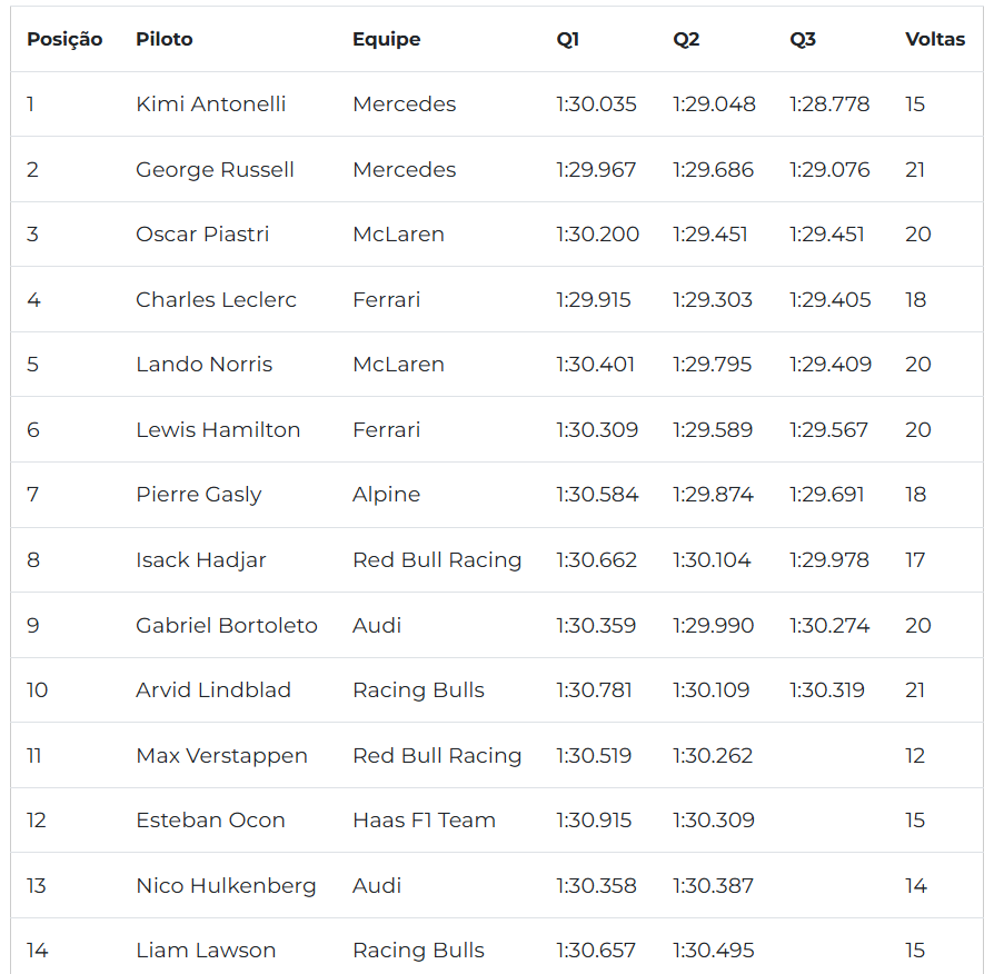 A definição do grid ocorreu na madrugada deste sábado, quando o italiano voltou a garantir o primeiro lugar. Antonelli foi seguido pelo companheiro de equipe, George Russell, além de Oscar Piastri, da McLaren, e Charles Leclerc, da Ferrari.