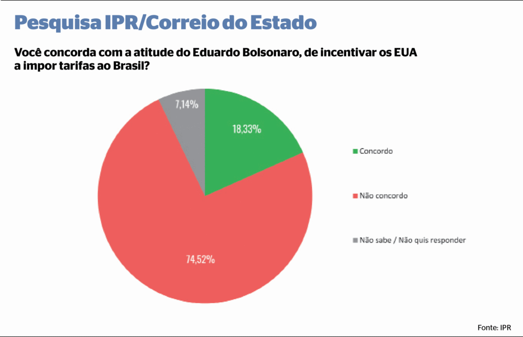 No levantamento 74,52% da população de Mato Grosso do Sul com idade eleitoral (acima de 16 anos) não concorda com a atitude de Eduardo Bolsonaro de incentivar os Estados Unidos a impor tarifas contra o Brasil.
