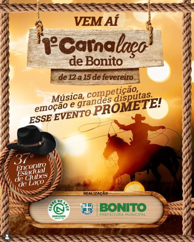 A cidade de Bonito está se preparando para uma celebração inédita que promete agitar o mês de fevereiro: o 1º Carnalaço. O evento será realizado de 12 a 15 de fevereiro e fará parte da programação do 37º Encontro Estadual de Clubes de Laço, integrando esporte, música e tradição em uma grande festa para a cidade.