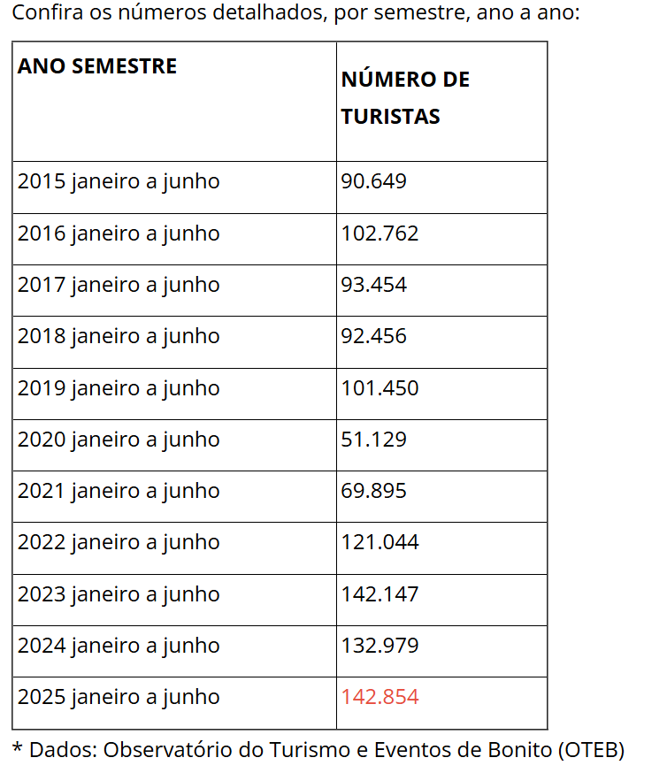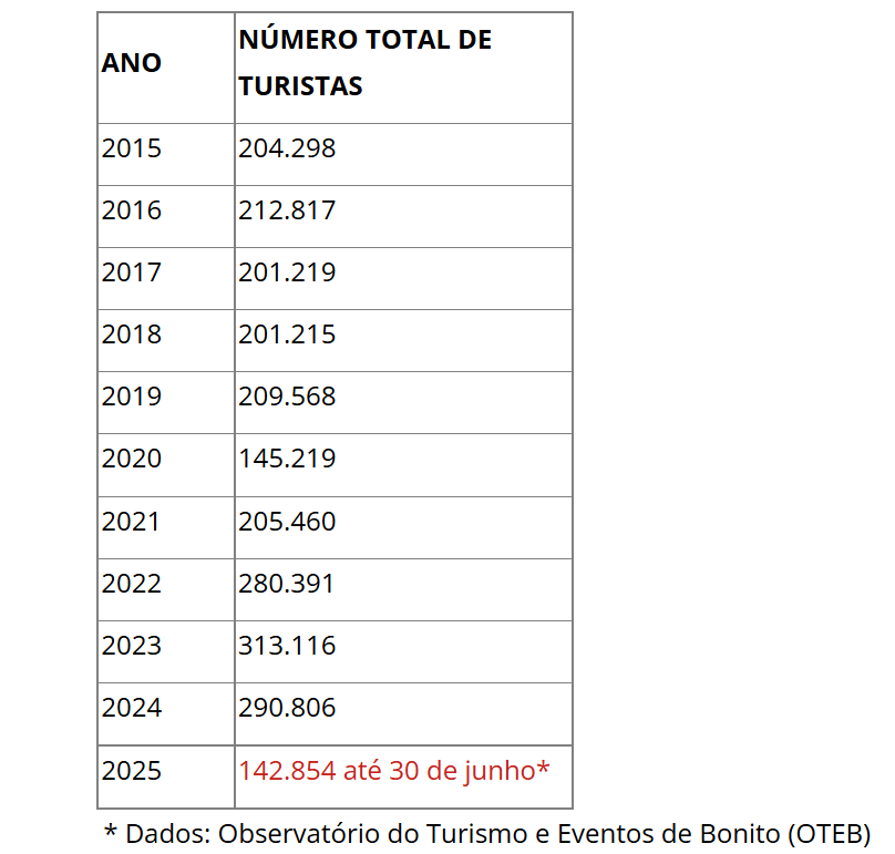 Dados divulgados pelo Observatório do Turismo e Eventos de Bonito (OTEB) apontam que o município recebeu 142.854 turistas entre 1º de janeiro e 30 de junho de 2025.