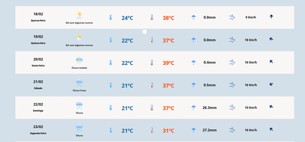 O dia mais chuvoso para Bonito nos próximos dias deve ser a segunda-feira (23), quando estão previstos 27.2 mm. Porém, a previsão também é de calorão. A mínima prevista é de 21ºC, enquanto a máxima pode chegar aos 31ºC.