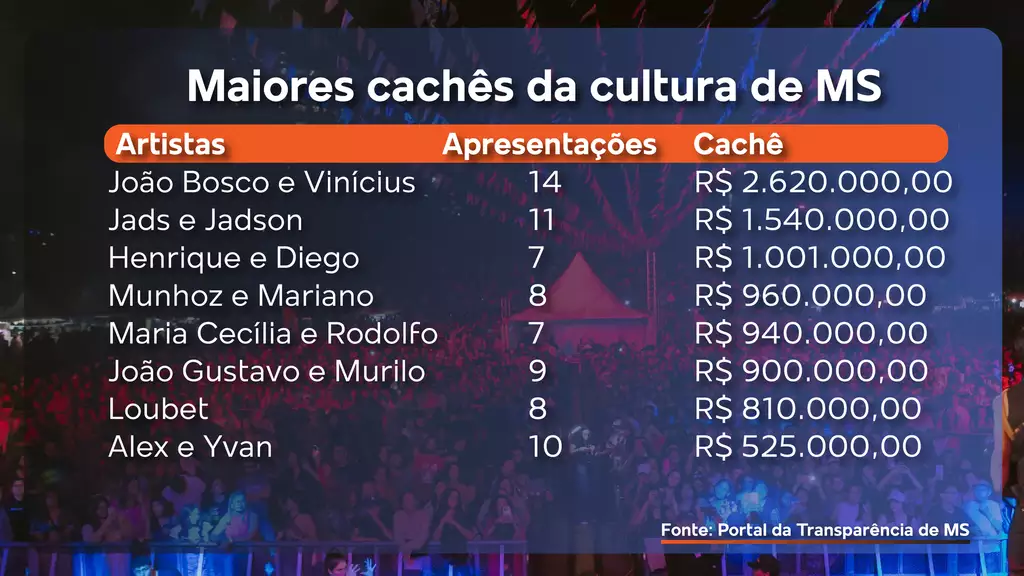 No ranking dos cachês milionários estão 8 duplas sertanejas que surgiram em Mato Grosso do Sul, várias delas que hoje vivem bem longe daqui. Com participação em 14 eventos ao longo de 2025, João Bosco e Vinícius, por meio da S4 Produções Artísticas, são os recordistas de pagamentos conforme site da transparência, do governo do Estado.