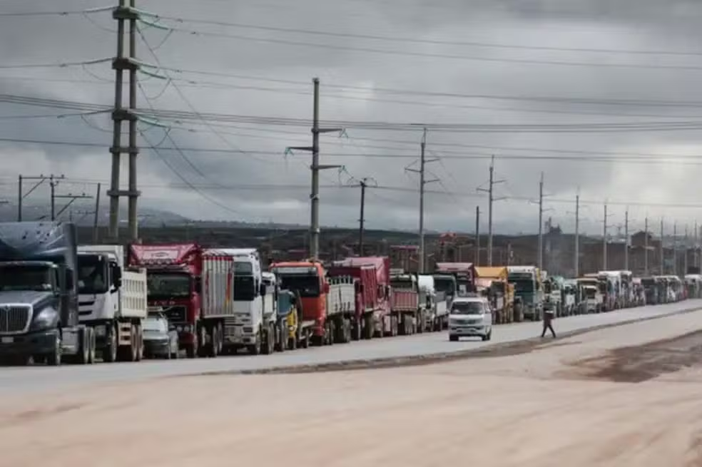 Crise na Bolívia levou à escassez de combustível; na foto, caminhões aguardam em fila para abastecer em Viacha, perto de La Paz em 2025 — Foto: Jorge Mateo Romay Salinas/Anadolu via Getty Images/BBC