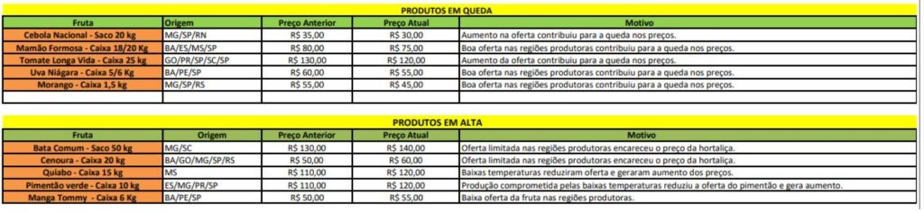 Entre as hortaliças que apresentaram queda no valor, a cebola nacional merece destaque, com uma redução de 14% no preço. O saco de 20 kg da cebola passou a ser comercializado por R$ 30, favorecendo os consumidores.