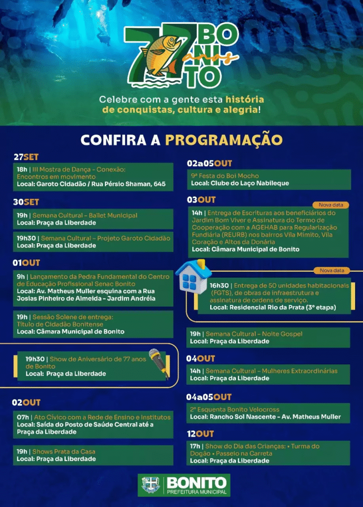 Bonito, destino sul-mato-grossense mais procurado do Brasil, completa 77 anos nesta quinta-feira (2). Localizada na região sudoeste de Mato Grosso do Sul, a cidade é popularmente conhecida como a ‘Capital do Ecoturismo’.