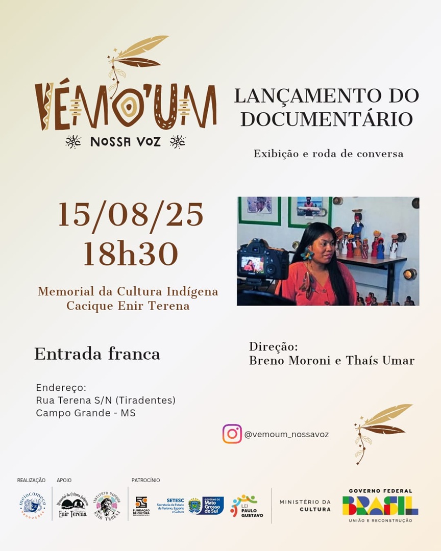 Um mergulho na memória, identidade e cotidiano da aldeia urbana Marçal de Souza chega às telas nesta sexta-feira (15), às 18h30, no Memorial da Cultura Indígena Cacique Enir Terena, em Campo Grande. O documentário “Vémo’Um”, que em Terena significa “Nossa Voz”, é uma obra que mistura escuta, afeto e resistência, revelando histórias contadas pelos próprios protagonistas: indígenas em contexto urbano na capital sul-mato-grossense.