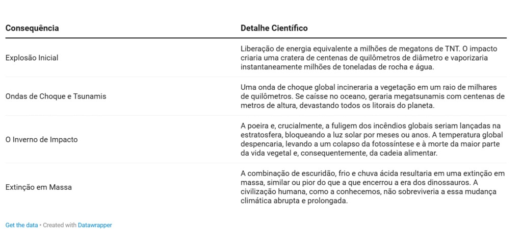 Mas e se, por um desvio improvável da física, o 3I/ATLAS, com seu limite superior de 5,6 km, estivesse em rota de colisão? O que a ciência nos diz sobre as consequências de um impacto de um objeto interestelar tão rápido?