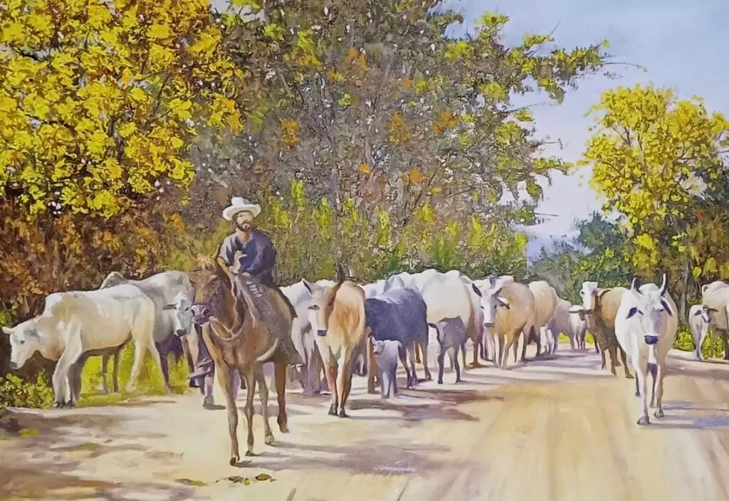 “Sou autodidata, comecei por motivos de depressão e a cura encontrei na pintura. É onde me encontro com minhas raízes, minha alma pantaneira. Desde criança via as comitivas do Pantanal, os pés de ipês nos corixos, os boiadeiros. Canalizei toda essa experiência. Achei na minha arte uma maneira de expressar através. Entre natureza e civismo pulsa o mesmo coração”.