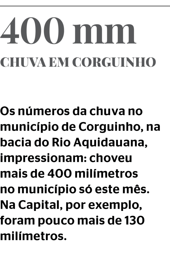 Segundo dados do Instituto Nacional de Meteorologia (Inmet), Corguinho registrou mais de 400 milímetros de chuva desde o dia 1º, e Aquidauana já ultrapassou a marca de 115 milímetros. Contudo, o que preocupa as autoridades dos municípios são os próximos dias, já que o clima chuvoso não deve dar trégua até amanhã.