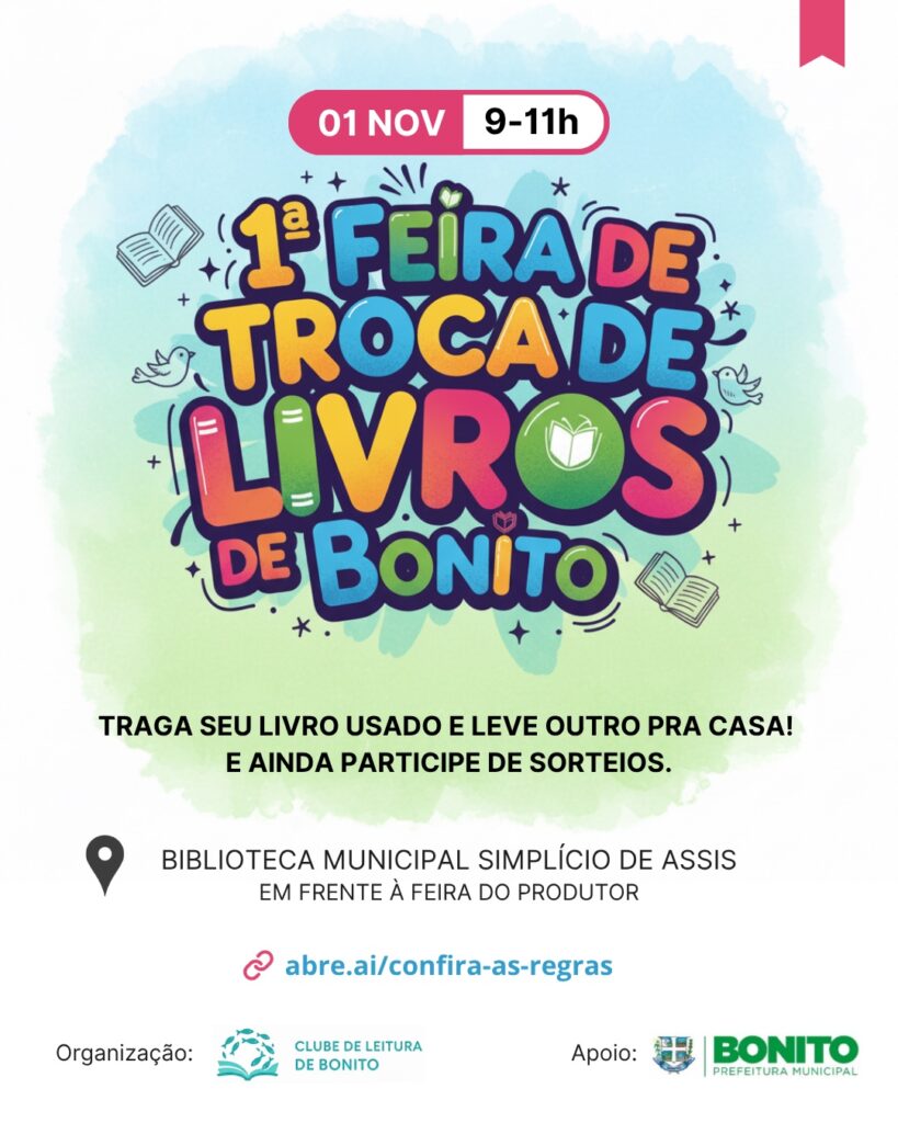 No dia 1º de novembro, o Clube de Leitura de Bonito realiza a primeira Feira de Livros do município, ocupando a Biblioteca Pública Municipal (na frente da Feira do Produtor), cedida pela Secretaria de Educação, com atividades gratuitas, troca de livros, contação de histórias e sorteios literários.
