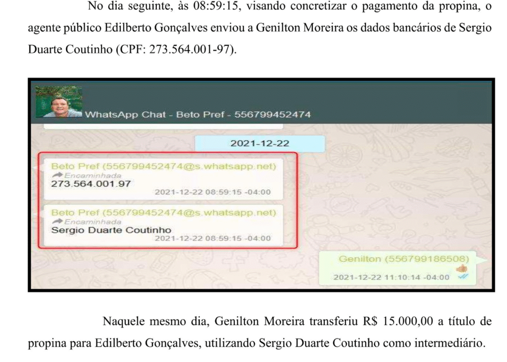 As conversas via WhatsApp revelam a naturalidade com que as transações eram tratadas. Após receber R$ 457 mil da prefeitura, em 19 de agosto de 2022, por serviços de manutenção em pontes de madeira, Genilton envia uma mensagem a Edilberto, que responde com um áudio: “Ta rico kkkk”. Dias depois, o empresário confirma o repasse da propina: “Deu certo lá viu, eu esqueci de te avisa aí”.