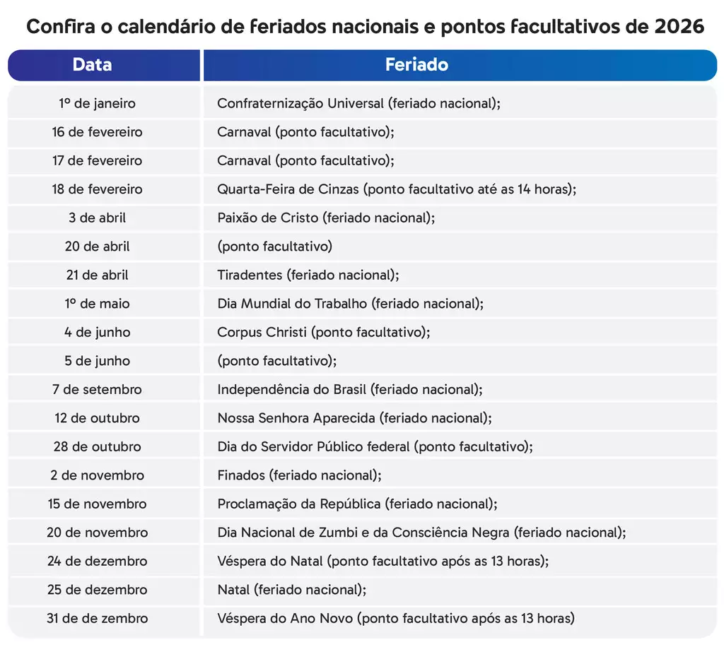 Ao todo, o próximo ano contará com dez feriados nacionais e nove dias de ponto facultativo no âmbito federal. Em nota, o ministério destacou que o calendário deverá ser cumprido sem prejuízo do funcionamento dos serviços essenciais à população, como saúde, segurança pública e fiscalização.