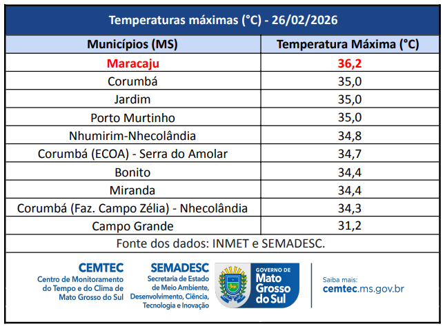 Os termômetros também registraram altas temperaturas, com destaque para Maracaju (36,2°C), Corumbá (35°C), Jardim (35°C), Porto Murtinho (35°C), Nhumirim-Nhecolândia (34,8°C) e Serra do Amolar (34,7°C).