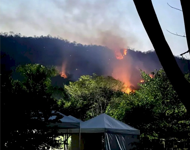 O fogo já ameaçou pelo menos cinco propriedades e chegou a áreas turísticas, incluindo pousadas e a cachoeira Boca da Onça, chegando ao 4º dia de queimadas nesta segunda-feira.