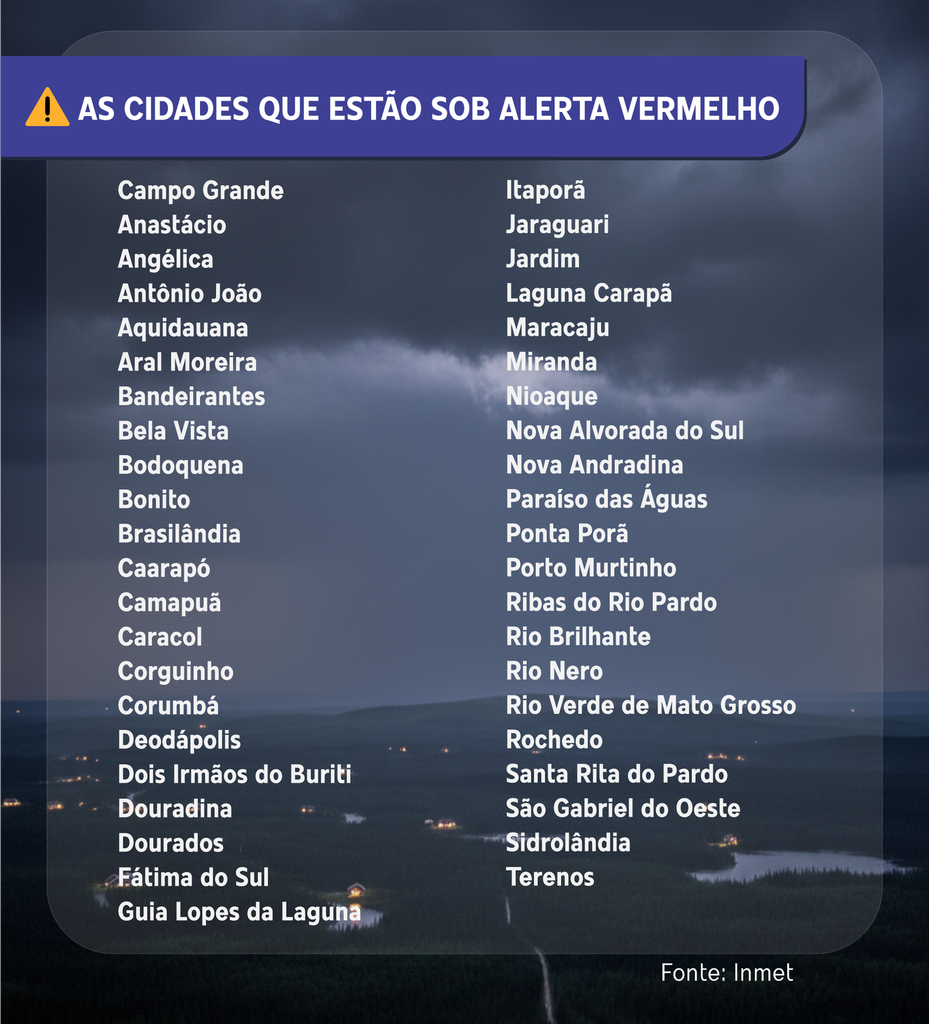 O Inmet (Instituto Nacional de Meteorologia) colocou todo o Mato Grosso do Sul sob alerta de tempestade e 44 cidades em alerta vermelho, classificado como de “grande perigo” para acumulado de chuva. Os avisos começaram a valer no domingo (1º) e seguem até a noite de quarta-feira (4), com risco elevado de danos à população.
