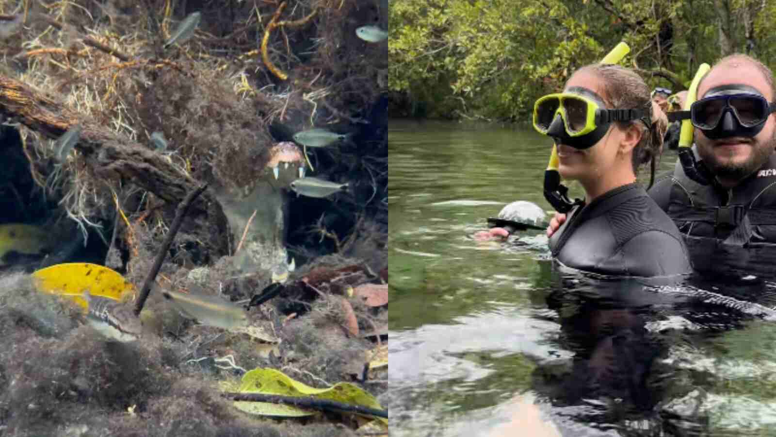 Um casal de turistas teve uma grande surpresa ao fazer um passeio de flutuação em Bonito. Os donos do perfil do TikTok ‘Onde saber antes de ir’, publicaram um vídeo debaixo d’gua, em que notam a presença de um jacaré camuflado na vegetação aquática.