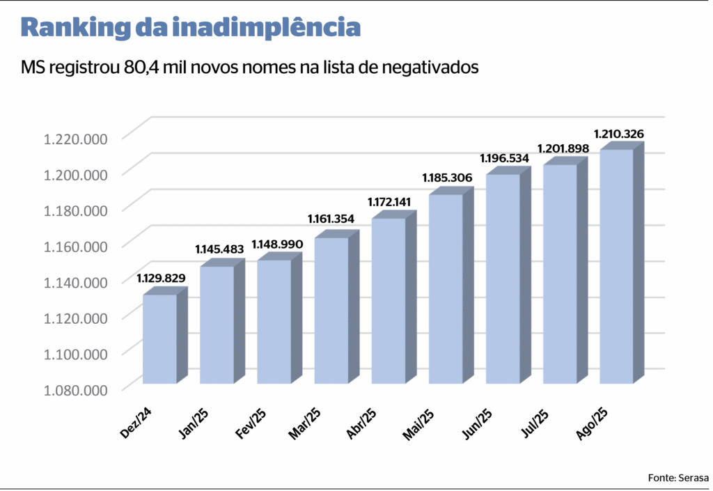 O endividamento em Mato Grosso do Sul atingiu o nível mais alto da série histórica e já compromete mais da metade da população adulta. Segundo os dados mais recentes da Serasa, o Estado soma 1.210.326 moradores com o nome negativado, o equivalente a 56,1% da população. Juntos, eles acumulam 5,27 milhões de dívidas, que totalizam R$ 8,76 bilhões.