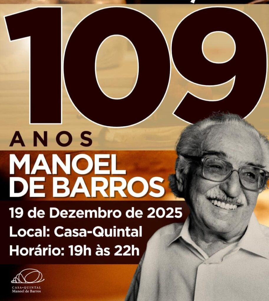 As celebrações dos 109 anos do poeta culminaram na sexta-feira (19), data de nascimento do poeta, com uma noite especial no Museu Casa Quintal, sua antiga residência em Campo Grande. O evento “Celebre conosco os 109 anos de Manoel de Barros” promete “uma noite de arte, música e poesia para honrar quem transformou o banal em beleza”.