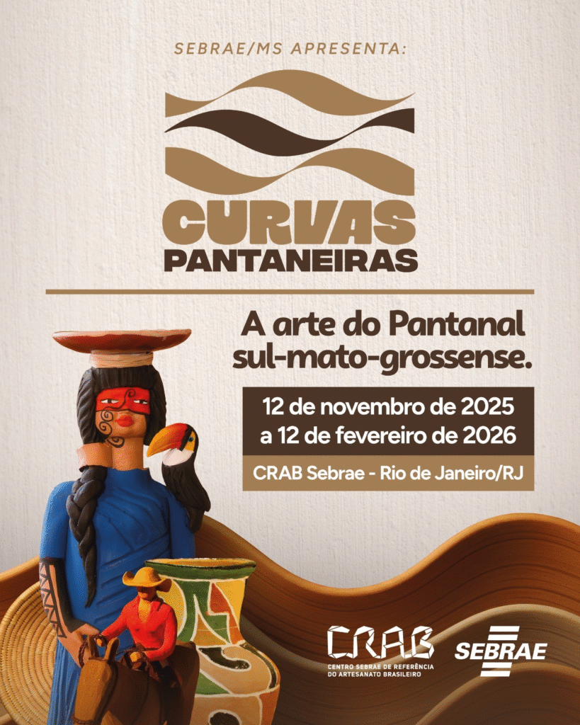 A mostra é uma realização do Sebrae/MS e do CRAB/RJ, com parceria da Fundação de Cultura de Mato Grosso do Sul (FCMS), que realizará o transporte das peças. Com curadoria da artista visual Buga Peralta, a exposição traduz a paisagem e o imaginário pantaneiro em obras feitas de cerâmica, madeira, fibras, tecidos, bordados e papel machê. São peças que revelam a fluidez das águas, a leveza da fauna e o ritmo das comunidades ribeirinhas — símbolos de uma cultura que se reinventa sem perder suas raízes.