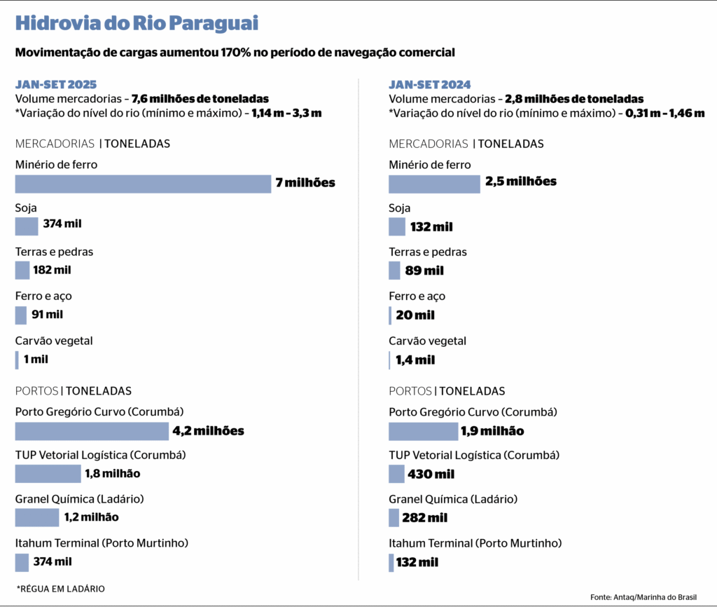 O Rio Paraguai, em condição de navegação comercial favorável, teve 7,6 milhões de toneladas de mercadorias transportadas este ano. Os dados são referentes ao período de janeiro a setembro, quando a hidrovia registrou níveis favoráveis para o transporte comercial, acima do 1,5 metro em Ladário.