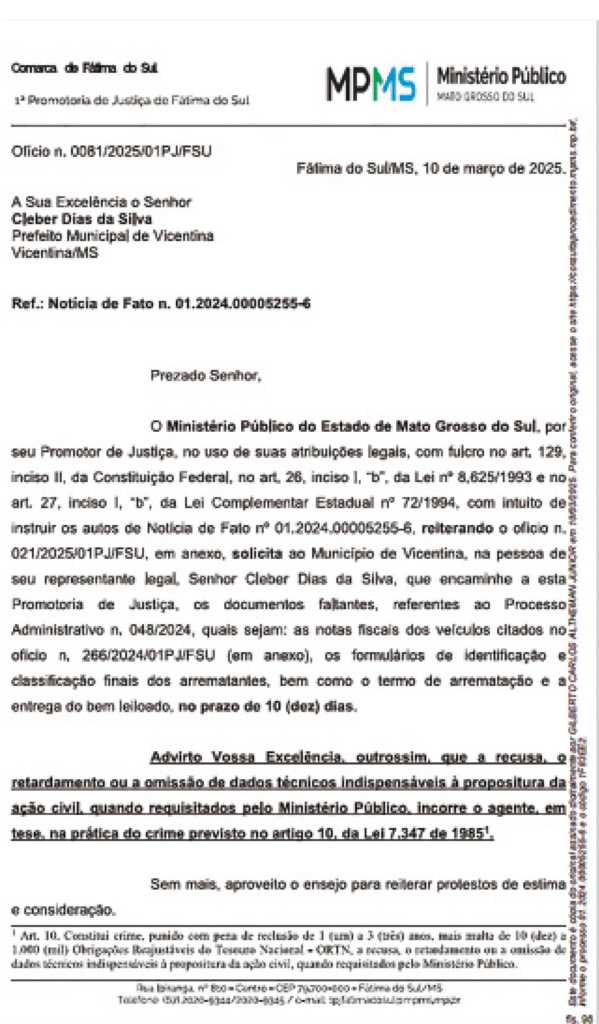 Ele instituiu os autos da Notícia de Fato nº 01.2024.00005255-6 para solicitar ao prefeito de Vicentina, Cleber Dias da Silva (MDB), documentos referentes ao Processo Administrativo nº 266/2024/01PJ/FSU, os formulários de identificação e classificação final dos arrematantes, bem como o termo de arrematação e a entrega do bem leiloado.