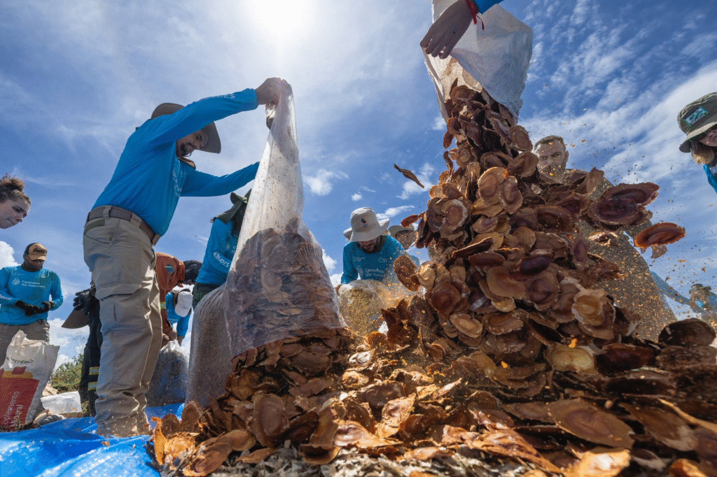 Em seguida, foi realizada a tradicional muvuca de sementes, técnica que mistura diferentes espécies para garantir diversidade, resiliência e maior cobertura vegetal no início da restauração. Após o preparo da mistura, a equipe iniciou o plantio manual, linha por linha, cobrindo toda a área prevista para esta fase inicial.