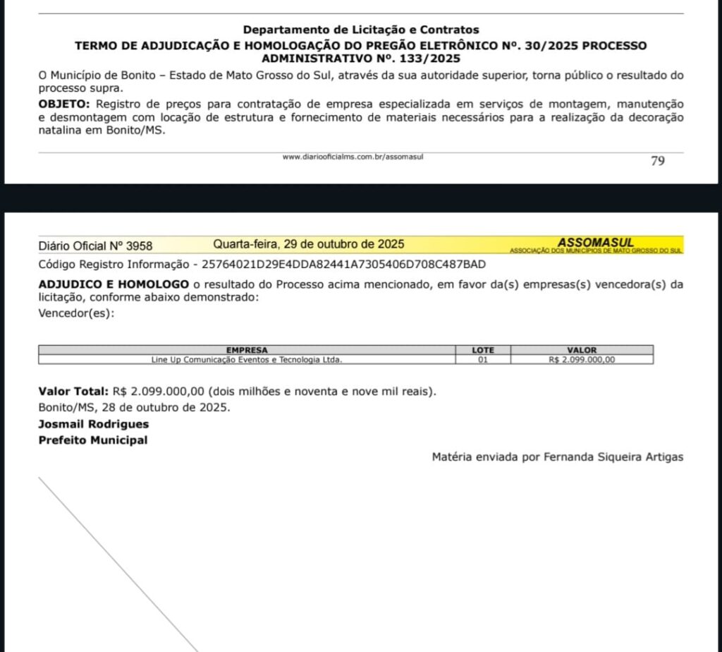 A Prefeitura de Bonito homologou o registro de preço para decorar o principal destino turístico de Mato Grosso do Sul para o Natal em 2025. Conforme publicado na edição desta quarta-feira (29) do Diário da Assomasul (Associação dos Municípios de Mato Grosso do Sul), a empresa Line Up Comunicação Eventos e Tecnologia Ltda. venceu a licitação neste ano, por R$ 2.099.000,00.