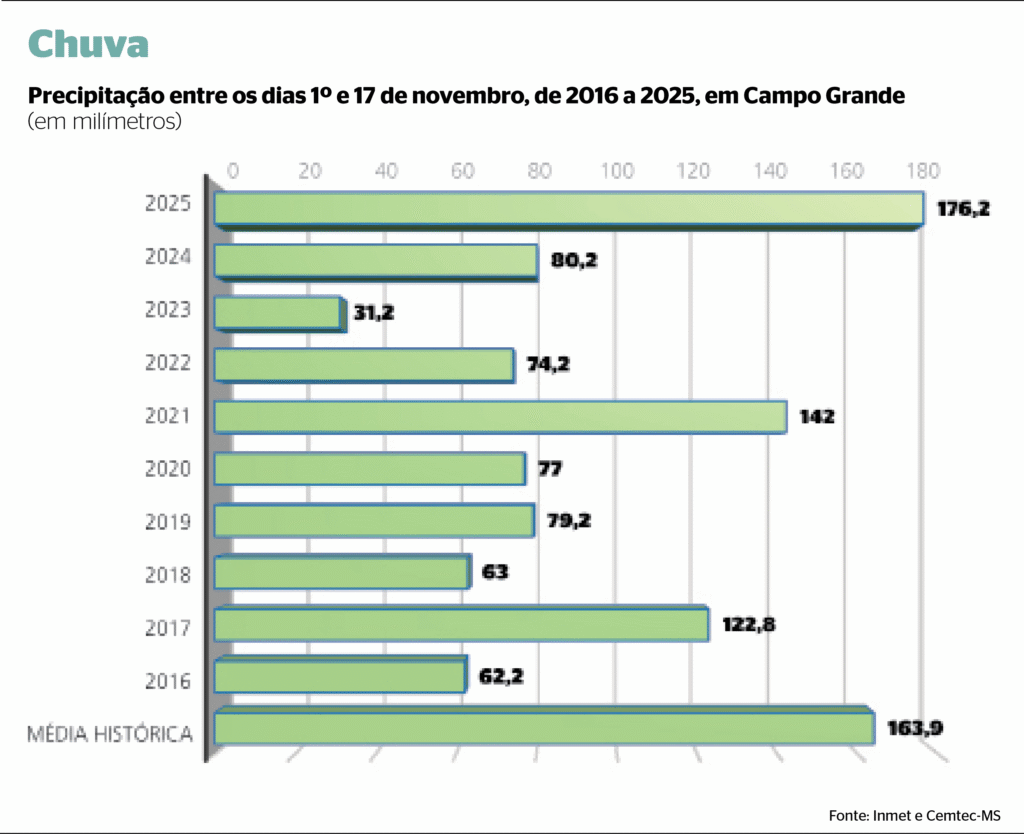 Levantamento feito pela reportagem, com base em dados do Instituto Nacional de Meteorologia (Inmet) e do Centro de Monitoramento do Tempo e do Clima de Mato Grosso do Sul (Cemtec-MS), mostrou que este ano já superou o total de precipitação registrado em 2024 em Campo Grande: este ano foram 963 mm, contra 780,6 mm no ano passado.