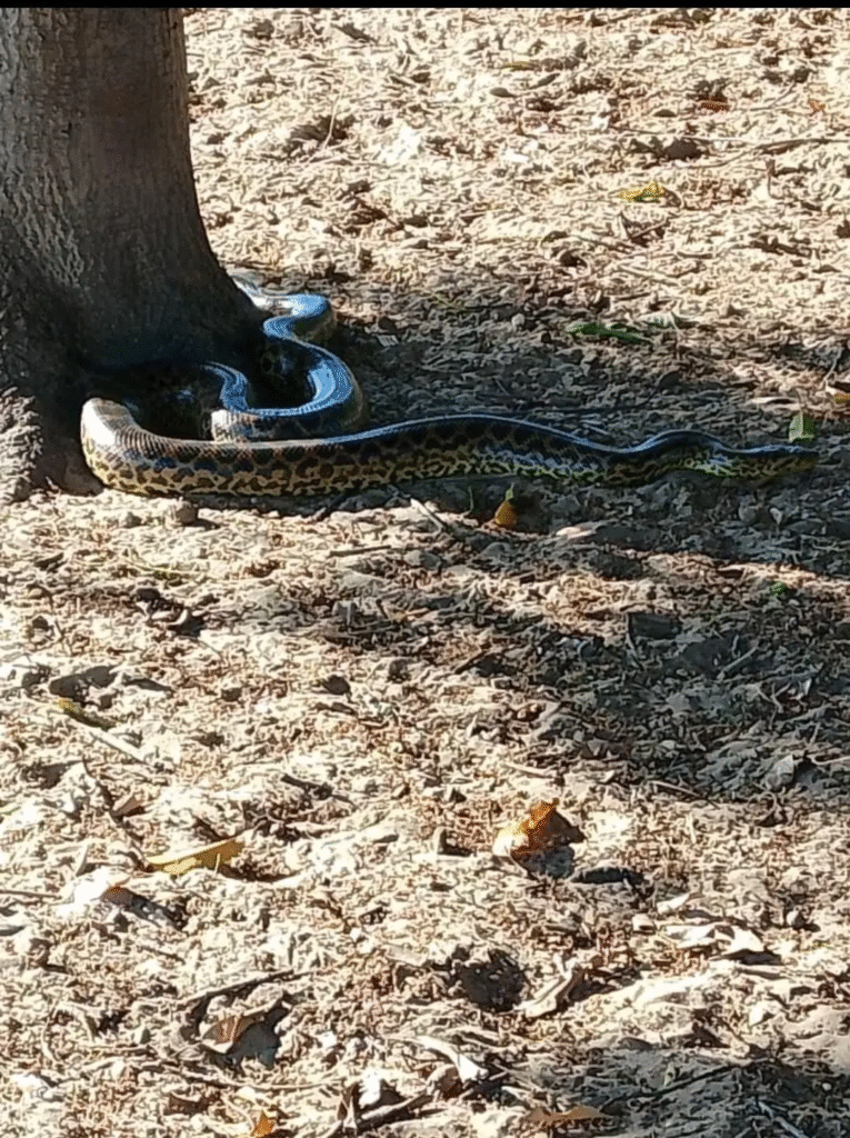Tranquilas, elas nem se assustaram com a presença humana. Mas não só as felinas são vistas com frequência. Outra espécie de gigante que vive no bioma é a sucuri. Elas também já deram o ar da graça: uma das imagens mostra uma sucuri-amarela deslizando tranquilamente pela fazenda.