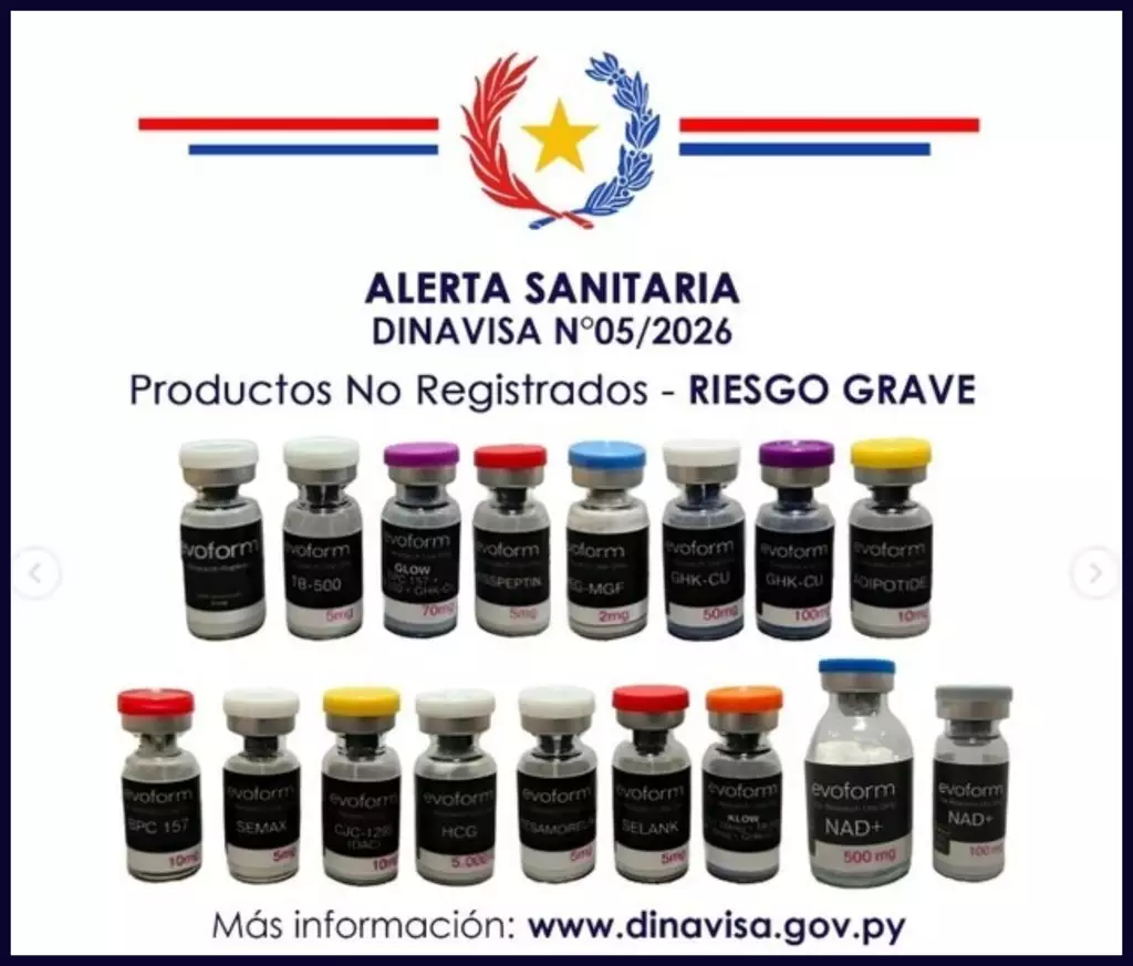 A apreensão ocorre em meio a um alerta emitido nesta semana pela Dinavisa (Dirección Nacional de Vigilancia Sanitaria), que listou diversos medicamentos não autorizados para comercialização em território paraguaio. O relatório aponta a venda irregular de produtos que alegam conter peptídeos e destaca que não possuem registro sanitário válido no país, sendo proibidas sua importação, distribuição e venda.