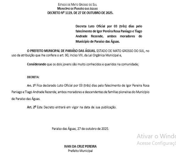 “A Prefeitura de Paraíso das Águas, em nome do Prefeito Municipal Ivan Xixi, do vice-prefeito Roberto Carlos, dos secretários municiais e todos os servidores e colaboradores do executivo municipal, expressa condolências e toda solidariedade às famílias dos jovens IGOR PEREIRA ROSA PANIAGO E TIAGO ANDRADE REZENDE, que precocemente nos deixaram.