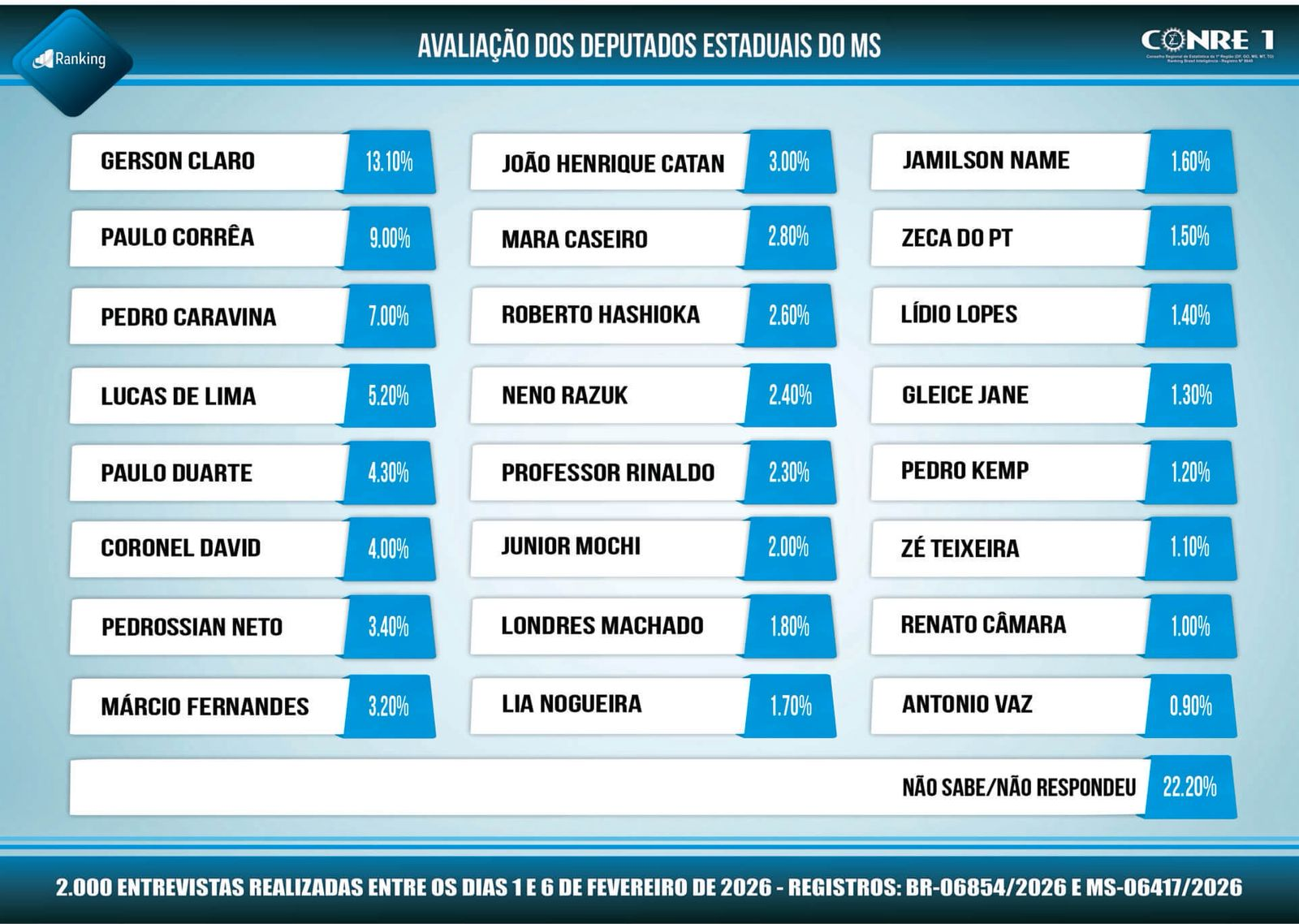 De acordo com a pesquisa, Caravina recebeu 7% das menções espontâneas dos entrevistados, ficando atrás apenas do presidente da Assembleia, Gerson Claro, e do primeiro-secretário, Paulo Corrêa. O resultado tem destaque por ser a primeira sondagem oficialmente registrada em 2026, período em que o eleitorado começa a formar suas percepções sobre os possíveis candidatos.