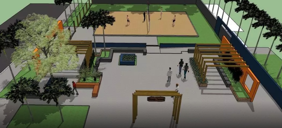 O projeto contempla a criação de uma praça com paisagismo, bancos, iluminação pública, áreas sombreadas e uma quadra de areia, destinada à prática de esportes como vôlei e futevôlei. O ambiente será voltado ao lazer, encontros e atividades ao ar livre.