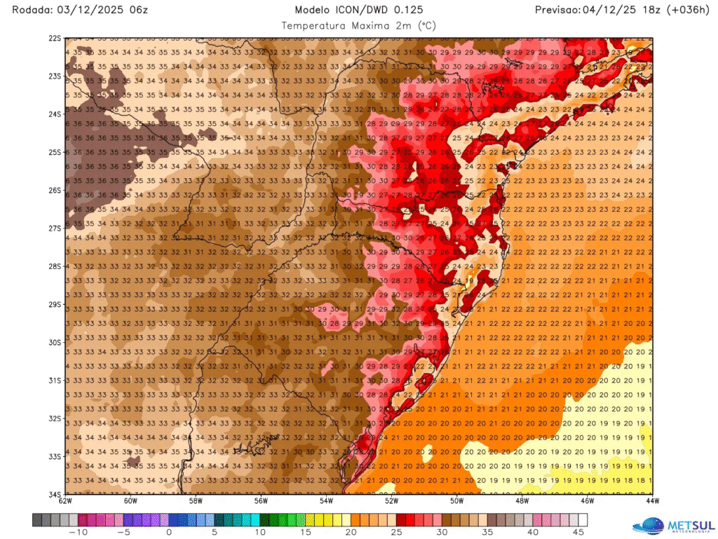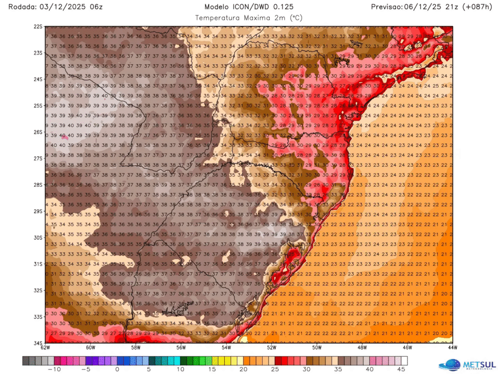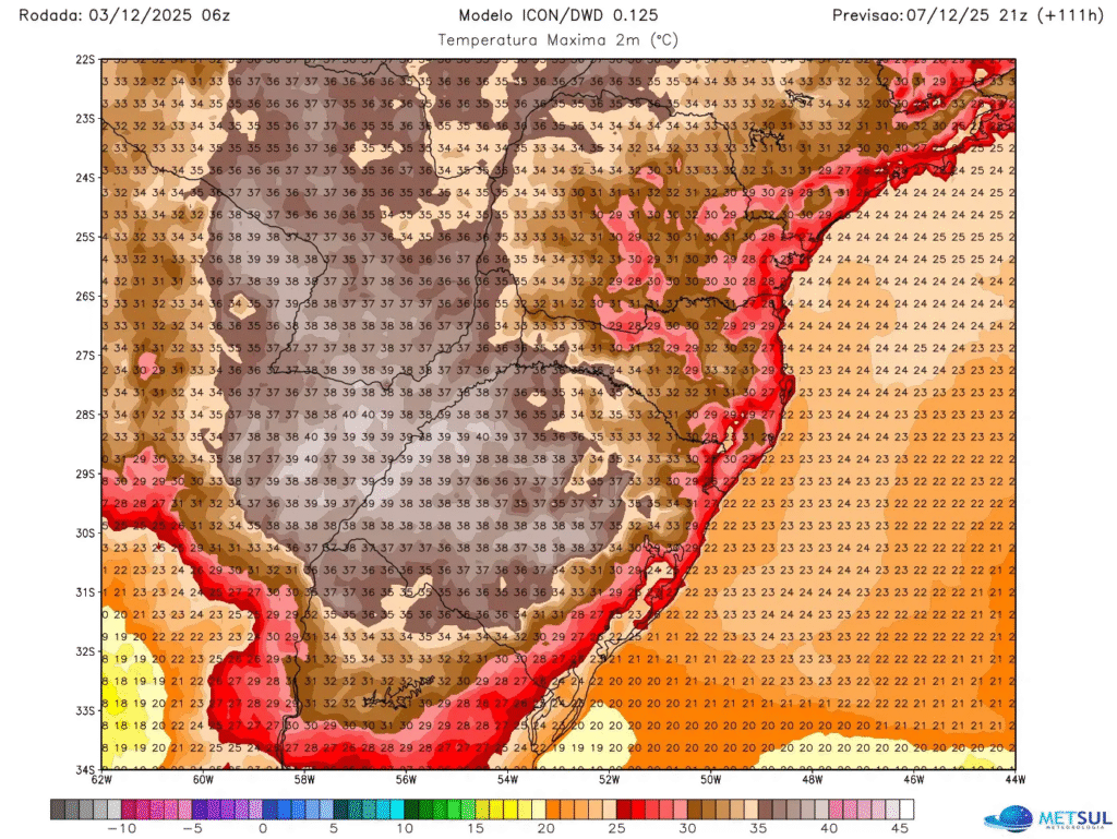 O primeiro episódio de calor extremo de verão com marcas de 40ºC já tem data para chegar e vai proporcionar uma sequência de dias com tardes escaldantes no Rio Grande do Sul, projeta a MetSul Meteorologia.