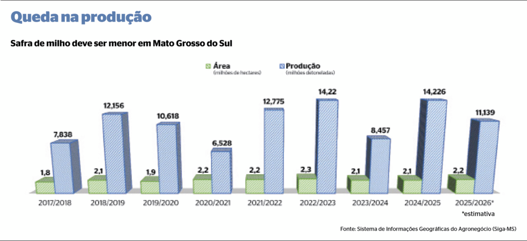 Mesmo com expansão da área cultivada, a segunda safra de milho em Mato Grosso do Sul deve registrar uma forte retração na produção em 2025/2026.