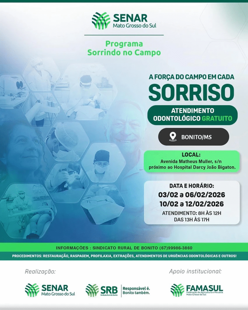 O município de Bonito recebe, nos dias 03 a 06 de fevereiro e 10 a 12 de fevereiro, o Programa Sorrindo no Campo, iniciativa do SENAR/MS que oferece atendimento odontológico gratuito à população. Os atendimentos acontecerão no Sindicato Rural de Bonito/MS, localizado na Avenida Matheus Muller, ao lado do Hospital Darcy João Bigaton, nos horários das 08h às 12h e das 13h às 17h.