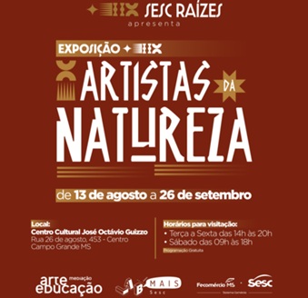 O Sesc MS realiza, a partir desta quarta-feira, dia 13 de agosto, a exposição “Artistas da Natureza”, o Centro Cultural José Octávio Guizzo, em Campo Grande, com entrada gratuita. Pela primeira vez no estado, uma exposição totalmente voltada ao protagonismo indígena, reunindo obras, saberes e expressões culturais de oito etnias presentes em Mato Grosso do Sul. A iniciativa integra os projetos Sesc Raízes, Sesc Mediações e Sesc LABmais, e conta com apoio da Fundação de Cultura de MS, da Subsecretaria de Políticas Públicas para Povos Originários do Governo de MS e da Faculdade de Artes, Letras e Comunicação da UFMS.