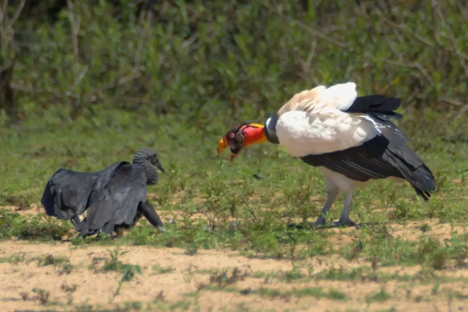 Uma imagem registrada no Pantanal mostra, com clareza, quem lidera a hierarquia entre os urubus. Diante de um urubu-preto, o urubu-rei se impõe sem confronto e assume o controle da carcaça, evidenciando a diferença de porte e força entre as espécies.
